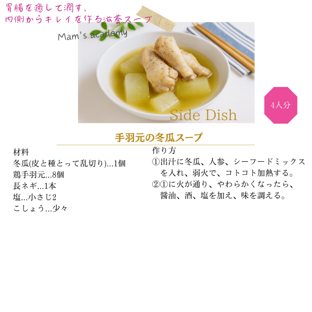 手羽元の冬瓜スープ 2025 11/26 mam's academyとは 汁物 #冬瓜 #手羽元 #長ネギ mam's academyとは 汁物 むくみ 生徒さん専用 疲労 美肌 ツナの冬瓜スープ 卵とコーンの中華スープ